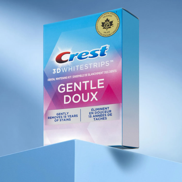 Miếng dán trắng răng Crest 3D White Gentle Doux phù hợp với răng nhạy cảm.