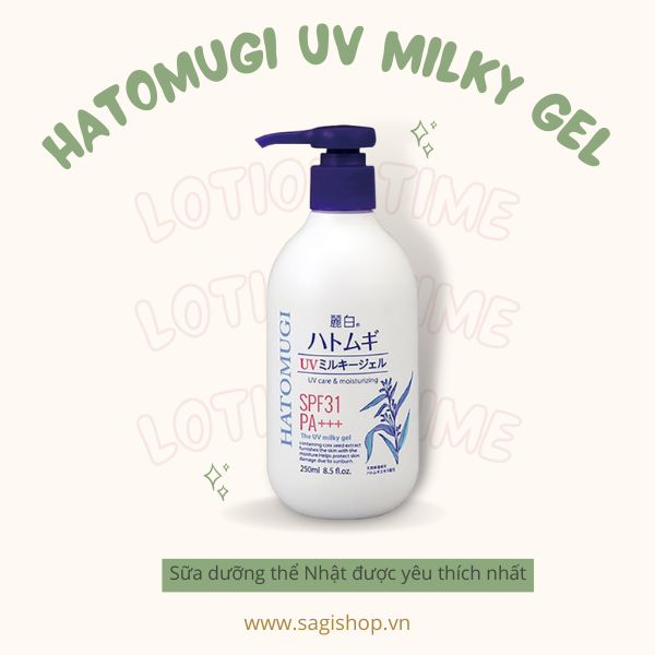 Sữa dưỡng thể chống nắng, dưỡng ẩm và làm sáng da Hatomugi UV Milky Gel SPF50 PA+++ vừa chống nắng toàn thân vừa dưỡng da trắng mịn. Sản phẩm có chứa chiết xuất ý dĩ tự nhiên, được biết đến với nhiều công dụng dưỡng da. Sản phẩm vừa có tác dụng dưỡng ẩm, làm sáng da, lại vừa tạo lớp màng bảo vệ da khỏi tia UV có trong ánh nắng mặt trời. Sản phẩm được bán rất chạy tại thị trường Nhật Bản và đặc biệt có thể dùng cho cả mặt & body.