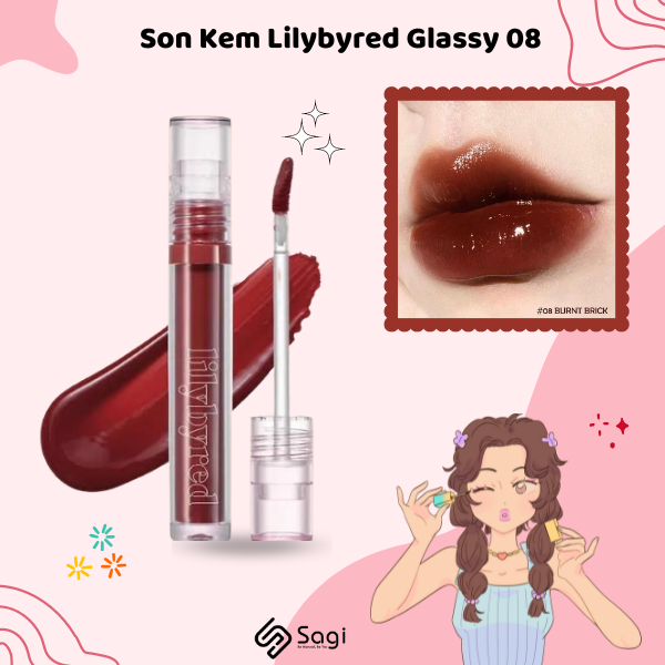 Son Tint Lilybyred Glassy Layer Fixing Tint No.08 Burnt Brick – Màu đỏ nâu socola : Là một trong những màu son khá mới, đỏ nâu mang đến vẻ đẹp ấn tượng, hút mắt. Chúng không quá nổi bật, rực rỡ như đỏ tươi lại không quá trầm như đỏ rượu. Thêm vào đó, một chút màu nâu nhẹ nhàng được kết hợp hài hòa mang đến tone màu khiến phái đẹp phải mê đắm. Màu son không quá trầm, không quá chói chang nhưng vẫn tôn lên được nét hấp dẫn có phần mặn mà, vừa trẻ trung nhưng lại pha chút lãng mạn cho các quý cô. Son đỏ nâu không khiến gương mặt bị lu mờ mà thậm chí chúng còn tôn da cực tốt. Đây cũng là lý do màu son này đáp ứng yêu cầu của số đông. Sự giao thoa giữa cổ điển và hiện đại giúp màu son trên dễ dàng thích nghi với nhiều kiểu trang điểm hay các loại trang phục khác nhau. Bạn có thể biến hóa đậm, nhạt theo nhu cầu và hoàn cảnh sử dụng cụ thể.