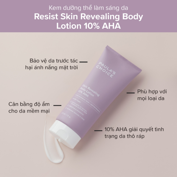 Skin Revealing Body Lotion with 10% AHA có khả năng loại bỏ tế bào chết nhẹ nhàng trên cơ thể, hoàn toàn không gây mài mòn da, “tống tiễn” các tế bào già cỗi trên cơ thể, giúp làn da mịn màng, trẻ trung và ứng dụng được với toàn bộ cơ thể.