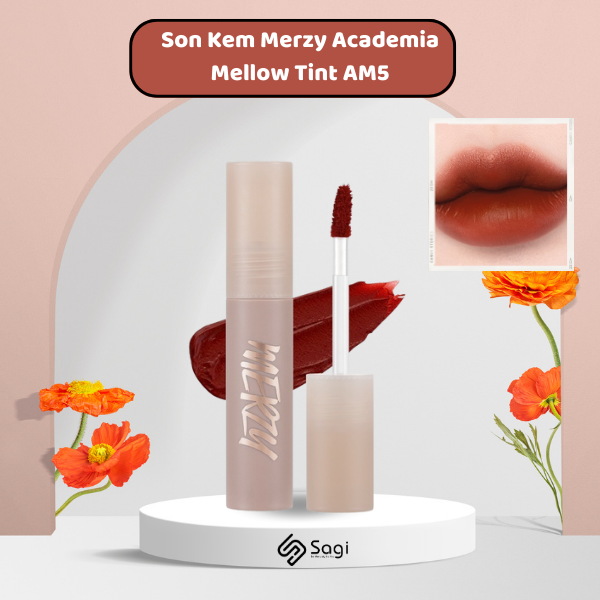 Son Kem Lì Merzy Academia Mellow Tint AM5 - Leather Bookmark: Đỏ gạch ấm áp nổi bật với công nghệ Double Blurry Cover Sytem chứa bộ đôi bột phủ kép và gel đàn hồi, đem đến kết cấu son môi mềm mại, nhẹ tênh, giúp môi giữ được độ căng mọng và tươi mới. Thêm vào đó, son có độ che phủ và bám dính cao, giúp che phủ mọi khuyết điểm trên môi và làm mờ rãnh môi hiệu quả. Sản phẩm có khả năng bám màu nâng cao mà không làm nặng môi giúp duy trì màu môi bền đẹp suốt cả ngày dài.