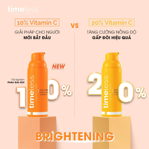 Tinh Chất Timeless 20% Vitamin C + E Ferulic Acid Serum là một trong những sản phẩm serum best seller từ thương hiệu Timeless nổi tiếng của Mỹ, giúp cung cấp cho làn da hàm lượng lớn Vitamin C, từ đó làm sáng và đều màu da, thúc đẩy tăng sinh Collagen cho da săn chắc mịn màng. Đồng thời, sản phẩm được tăng cường thêm Vitamin E và Ferulic Acid giúp cung cấp khả năng bảo vệ làn da chống lại các tác nhân ô nhiễm môi trường, ngăn ngừa lão hóa da. Đây sẽ là sự lựa chọn tuyệt vời cho làn da sạm xỉn màu và căng thẳng, mệt mỏi.