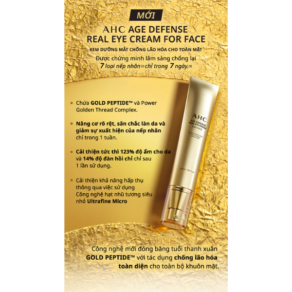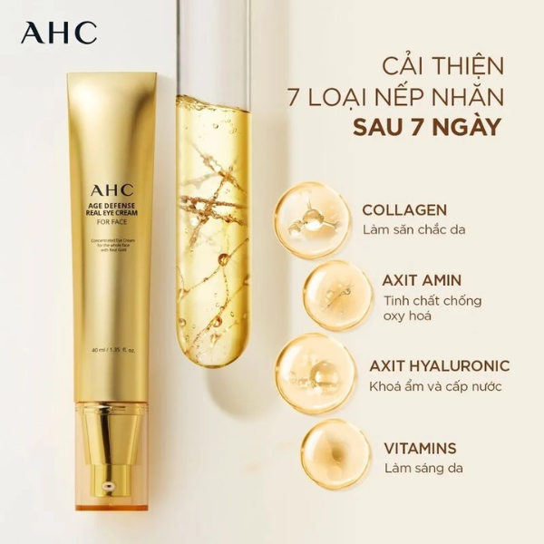 Kem Dưỡng Mắt AHC Ngăn Ngừa Lão Hóa Cho Toàn Mặt là dòng kem dưỡng mắt đến từ thương hiệu mỹ phẩm AHC của Hàn Quốc, sử dụng cho mắt và toàn mặt với hiệu quả ngăn ngừa 7 nếp nhăn lão hoá: nếp nhăn quanh trán, đường nhăn mày, vết chân chim, nếp nhăn rãnh nước mắt, khoé miệng, rãnh cười, vùng cổ. Sản phẩm áp dụng công nghệ độc quyền mới Gold Peptide và phức hợp Power Golden Thread đem lại hiệu quả nâng cơ rõ rệt, cải thiện độ đàn hồi, săn chắc, làm mờ các nếp nhăn và ngăn ngừa lão hoá da.