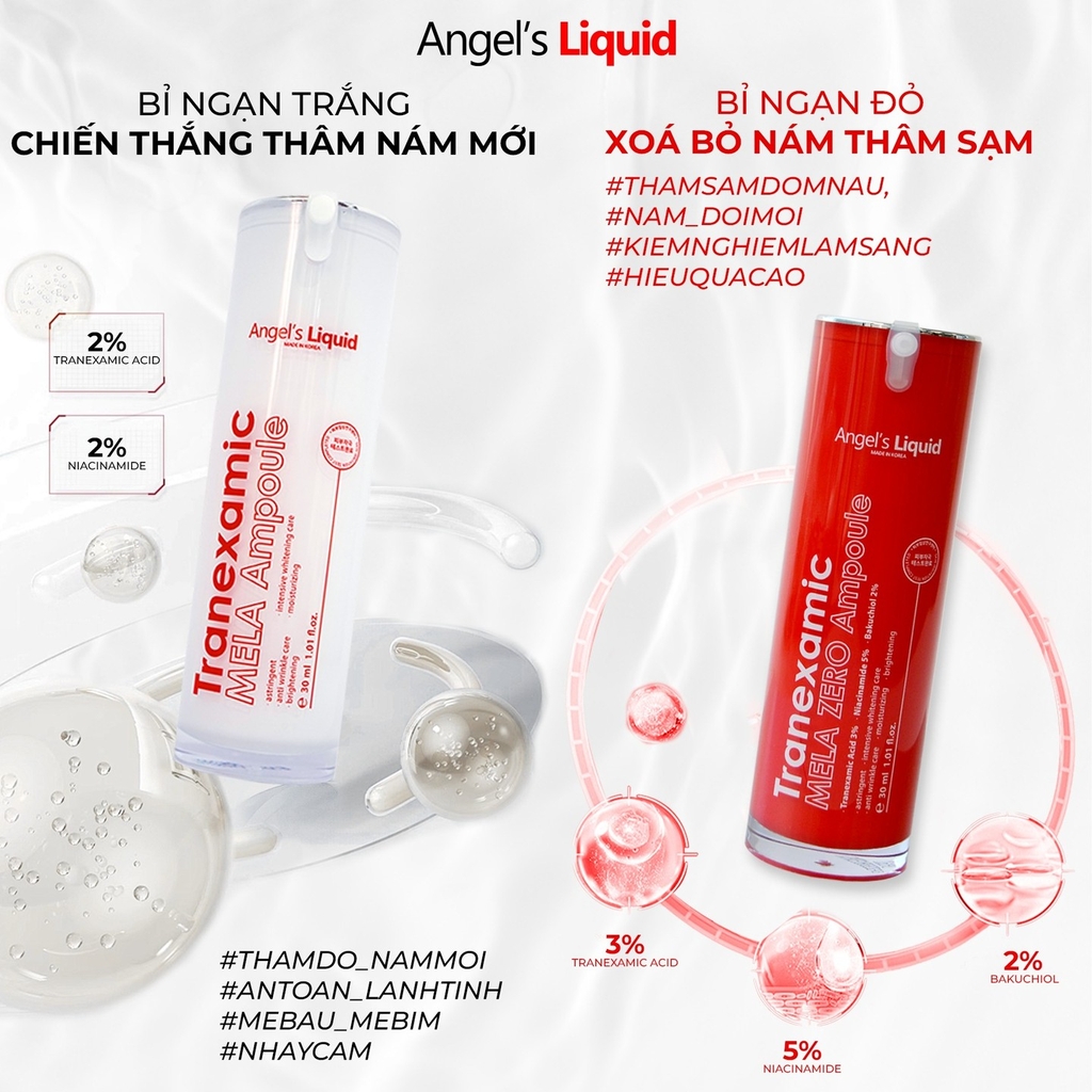 - Tinh Chất Hỗ Trợ Cải Thiện Thâm Đỏ, Mờ Sạm Nám Angel's Liquid Tranexamic Mela Ampoule 30ml chứa thành phần Tranexamic Acid 20,000ppm là hoạt chất được bác sĩ da liễu công nhận khả năng mờ thâm nám, cải thiện các vấn đề tăng sắc tố da do tiếp xúc trực tiếp với tia UV, ngoài ra còn giúp dưỡng sáng, làm đều màu da, làm mờ vết thâm sau mụn, giảm mẩn đỏ rõ rệt, làm mờ dần các vết nám xảy ra trong thời kỳ mang thai, hạn chế kích ứng cho da, bảo vệ và xoa dịu làn da bị tổn thương bởi các yếu tố gây hại từ môi trường như vi khuẩn bụi bẩn, nấm, phục hồi tổn thương da do tia UV có trong ánh nắng mặt trời gây ra.