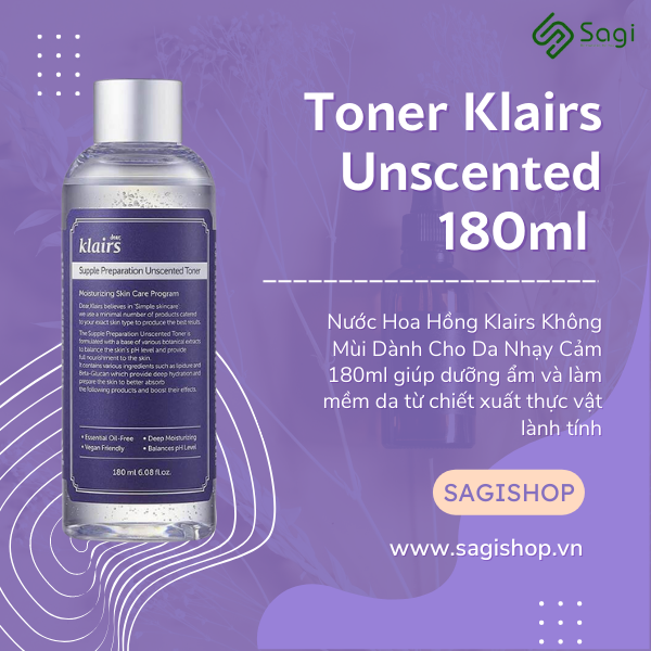 - Nước hoa hồng không mùi Klairs Supple Preparation Unscented cấp ẩm tức thì cho da, làm dịu làn da khô căng, kích ứng và cân bằng độ pH trên da, tăng hiệu quả của quá trình chăm sóc da hàng ngày.