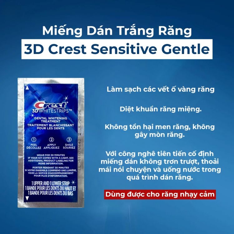 Miếng dán trắng răng Crest 3D White Whitestrips dòng Sensitive Gentle Routine là giải pháp làm trắng răng dành riêng cho những người có răng và nướu nhạy cảm. Sản phẩm giúp làm trắng răng một cách nhẹ nhàng, an toàn mà vẫn mang lại hiệu quả rõ rệt.