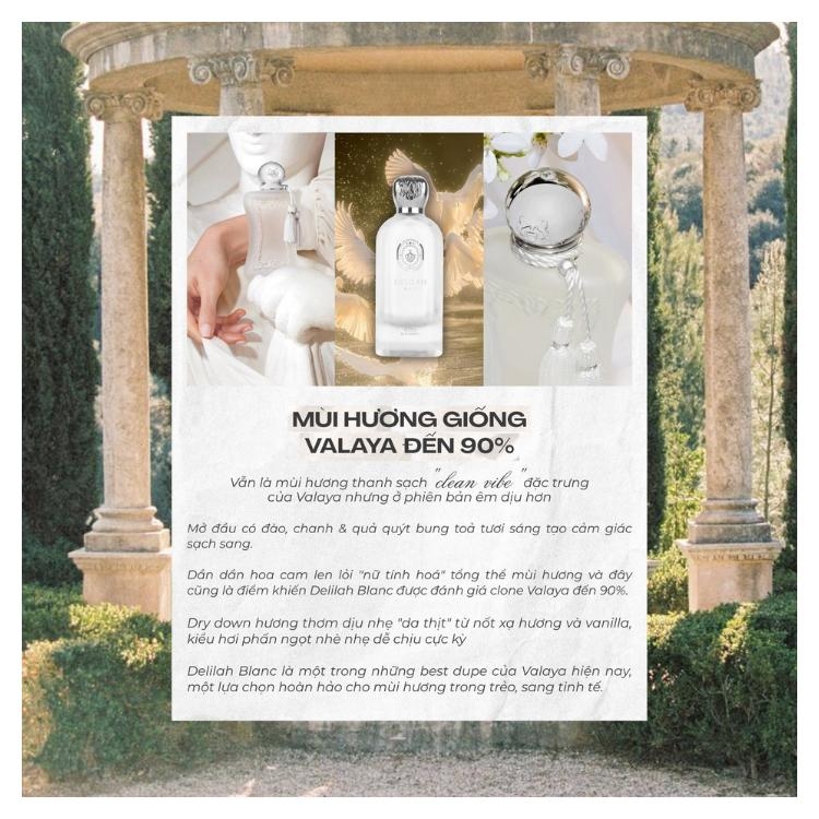 Maison Alhambra Delilah Blanc Eau De Parfum 100ml là phiên bản nước hoa nữ thanh lịch, lấy cảm hứng từ siêu phẩm Parfums de Marly Valaya. Với tone hương trắng tinh khôi, nhẹ nhàng nhưng vẫn phảng phất nét quyến rũ, Delilah Blanc mang đến cảm giác như làn gió tươi mát giữa ngày hè, gói trọn sự nữ tính và sang trọng trong từng nốt hương.