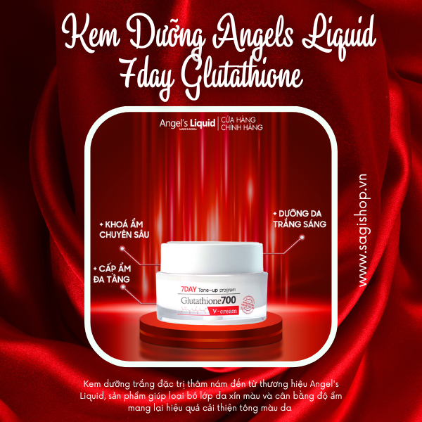 Kem Dưỡng Trắng Da, Mờ Thâm Nám Chỉ Trong 7 Ngày Angel's Liquid 7 Day Glutathione 700 V-Cream là kem dưỡng trắng đặc trị thâm nám đến từ thương hiệu Angel's Liquid, sản phẩm giúp loại bỏ lớp da xỉn màu và cân bằng độ ẩm mang lại hiệu quả cải thiện tông màu da cũng như giữ ẩm giúp da mềm mại mịn màng chỉ sau vài lần sử dụng.