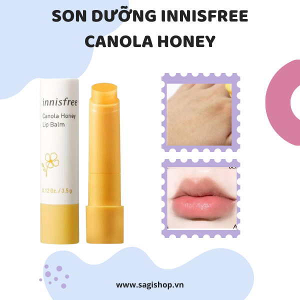 - Innisfree Canola Honey Lip Balm có chứa ba thành phần vàng gồm: mật ong nguyên chất, dầu hạt cải và bơ hạt xoài.
