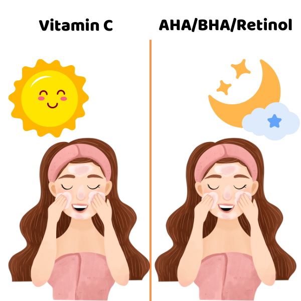 Tương tự như retinol, AHA/ BHA sẽ kém hiệu quả khi sử dụng buổi sáng, còn vitamin C lại hiệu quả vào buổi sáng hơn, nên chúng ta cũng có thể tách ra để sử dụng sáng và tối. Hoặc sử dụng luôn vitamin C cho cả sáng và tối, còn AHA/BHA thì chỉ sử dụng vào buổi tối.