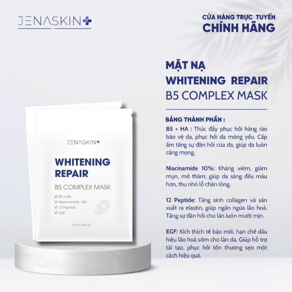 Mặt nạ Whitening Repair B5 Complex Mask Jenaskin là loại mặt nạ dành cho các cô nàng da khô hoặc thường xuyên phải tiếp xúc với điều hòa gây nên tình trạng da mất nước, bong tróc, khô ráp, sần sùi, da treament đỏ ráp muốn phục hồi và da ngăm đen, xỉn màu, không đều màu, da nhăn nheo, chảy sệ, lão hóa sớm.