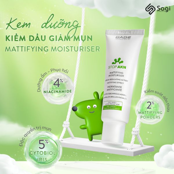 Kem dưỡng ẩm kiềm dầu trị mụn BABE Stop AKN Mattifying Moisturiser là sản phẩm chăm sóc da dầu mụn giúp kiểm soát dầu thừa, giảm bóng nhờn và mụn trứng cá, đồng thời cung cấp độ ẩm cho da giúp da luôn tươi sáng, khỏe mạnh. Kem dưỡng BABE Mattifying Moisturiser được đánh giá là một sản phẩm hiệu quả và an toàn cho việc điều trị mụn trên da.