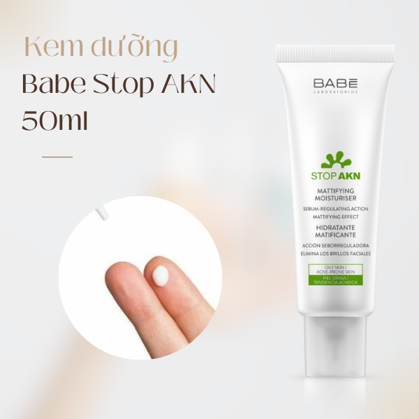 Kem dưỡng ẩm kiềm dầu trị mụn BABE Stop AKN Mattifying Moisturiser là sản phẩm chăm sóc da dầu mụn giúp kiểm soát dầu thừa, giảm bóng nhờn và mụn trứng cá, đồng thời cung cấp độ ẩm cho da giúp da luôn tươi sáng, khỏe mạnh. Kem dưỡng BABE Mattifying Moisturiser được đánh giá là một sản phẩm hiệu quả và an toàn cho việc điều trị mụn trên da.