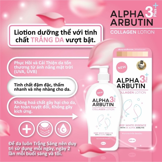 Sữa Dưỡng Trắng Toàn Thân Alpha Arbutin 3 Plus+ Collagen Lotion là dòng sản phẩm mới, gây được tiếng vang trong cộng đồng làm đẹp Thái Lan nhờ công thức cải tiến chứa Alpha Arbutin đậm đặc hơn so với phiên bản cũ. Phiên bản mới Sữa Dưỡng Trắng Toàn Thân Alpha Arbutin 3 Plus+ Collagen Lotion mang lại hiệu quả dưỡng ẩm tối ưu và làm trắng da vượt trội. Sữa Dưỡng Trắng Toàn Thân Alpha Arbutin 3 Plus+ Collagen Lotion đã được cấp phép, đạt tiêu chuẩn FDA của Thái Lan.