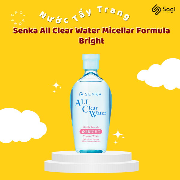 Nước tẩy trang SENKA A.L.L. CLEAR WATER Micellar Formula Bright (Mẫu Mới 2022) với công nghệ Micellar Nhật Bản, giúp làm sạch lớp trang điểm và bụi bẩm bám sâu trên da, cũng như loại bỏ lượng dầu thừa. Công thức chứa chiết xuất Hoa Anh Đào Fuji Nhật Bản và Cam Thảo giúp dưỡng sáng da & mờ sạm nám, kết hợp với chiết xuất lõi tơ tằm trắng và Hyaluronic Acid dưỡng da ẩm mượt. Sản phẩm có hương thơm dịu nhẹ, tạo nên cảm giác thoải mái, dễ chịu khi dùng và không gây nhờn rít da, không cần rửa lại với nước sau khi sử dụng.