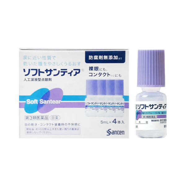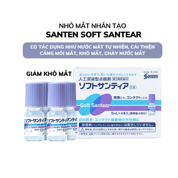 Nước nhỏ mắt Santen Soft Santear còn được biết đến là nước mắt nhân tạo với khả năng cung cấp độ ẩm cho mắt hoàn hảo, cải thiện nhanh tình trạng khô mắt, cộm mắt, mỏi mắt do thường làm việc với máy tính hay thường xuyên tiếp xúc với khói bụi. Đây cũng là một trong những loại thuốc nhỏ mắt rất được ưa chuộng tại Nhật.