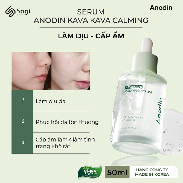 Serum làm dịu và cấp ẩm Anodin Kava Kava Calming có xuất xứ từ Hàn Quốc, là dòng dược mỹ phẩm thuần chay dành cho mọi loại da, đặc biệt là da nhạy cảm, da treatment được bác sĩ khuyên dùng. Được chiết xuất từ các thành phần tự nhiên lành tính, sản phẩm có công dụng giả lập màng lipids da, giúp phục hồi làn da tổn thương, bảo vệ da chống khỏi các tác nhân vi khuẩn gây mụn. Đồng thời giữ cho làn da trẻ trung, khỏe mạnh và ngăn ngừa các dấu hiệu lão hóa.