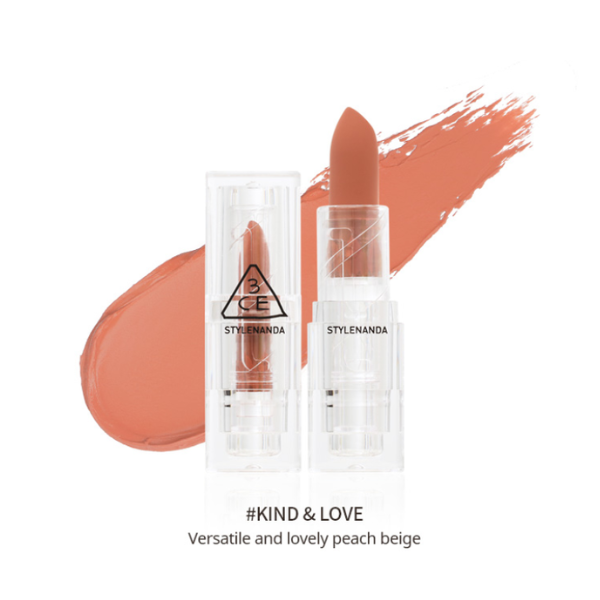 3CE Soft Matte màu Kind And Love mang sắc son tone cam nude, màu son tương đối kén da nhưng lại rất thời thượng, xứng đáng là một trong những thỏi son màu nude đẹp nhất.