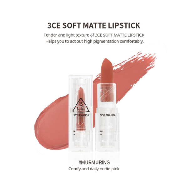 3CE Soft Matte màu Murmuring là tone son hồng nude kết hợp cùng base cam và đất. Màu son không quá nhạt nhòa, là một trong những tone màu MLBB đẹp nhất mà bạn nên sở hữu. Murmuring là bản Dupe của màu son Mellow Peach trong bảng màu Soft Matte của màu 3CE.