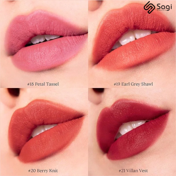 - Son có kết cấu son lì nhưng mịn như nhung, rất nhẹ và mướt môi, không làm khô môi hay lộ vân môi, lớp finish lì tuyệt đối nhưng sau khi ăn sẽ để lại lớp màu hồng đỏ tiệp lại trên môi cực xinh.