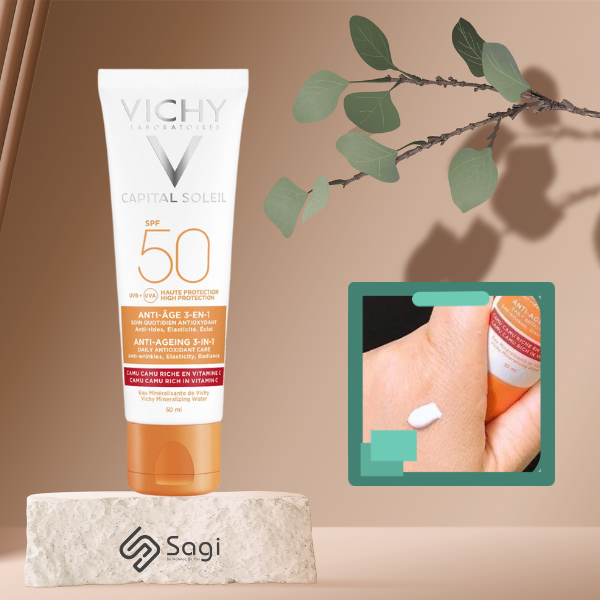 Kem Chống Nắng Chống Lão Hóa Vichy Capital Soleil Anti-Ageing 3-In-1 SPF50+ là kem chống nắng chứa màng lọc Mexoryl độc quyền giúp bảo vệ da tối ưu trước tia UVA và UVB, cùng với thành phần chính từ trà đen, vitamin C, vitamin E cùng nước khoáng núi lửa Vichy giúp bảo vệ da tối ưu và ngăn ngừa lão hóa hiệu quả thuộc thương hiệu dược mỹ phẩm Vichy đến từ Pháp.