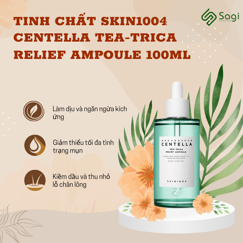 Skin1004 Madagascar Centella Tea-Trica Relief Ampoule 100ml là giải pháp khẩn cấp hoàn hảo cho làn da dễ bị mụn. Với các thành phần chính tập trung vào việc làm dịu da, công thức này giúp giảm viêm và kích ứng, tăng sức đề kháng của da mụn. Nếu làn da tiết dầu nhiều, sản phẩm này cũng sẽ giúp kiềm dầu và cân bằng tuyến dầu trên da, điều này sẽ ngăn ngừa việc phát sinh thêm mụn.