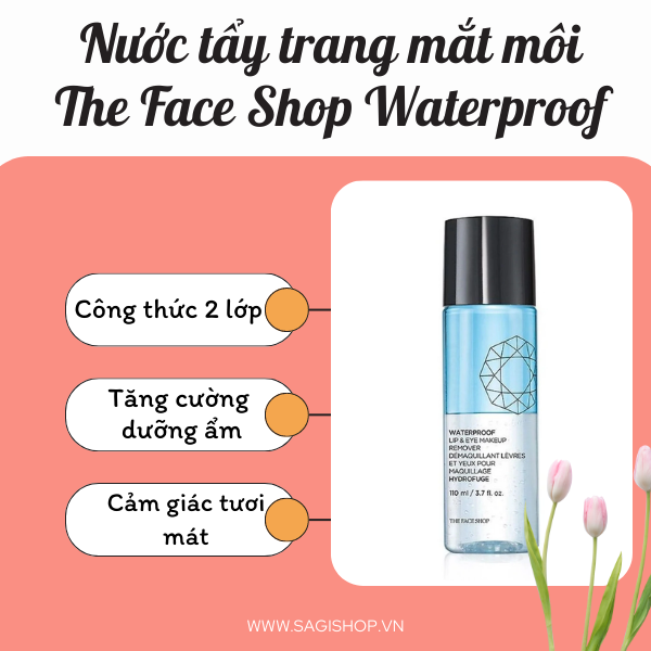 Nước tẩy trang mắt môi The Face Shop Waterproof có công thức dầu và nước hai lớp kết hợp với hỗn hợp dưỡng ẩm của các loại dầu, mang lại làn da sạch sẽ và tươi mát. Nhẹ nhàng loại bỏ ngay cả những lớp trang điểm không thấm nước cứng đầu nhất như mascara, kẻ mắt chống nước, son lì..
