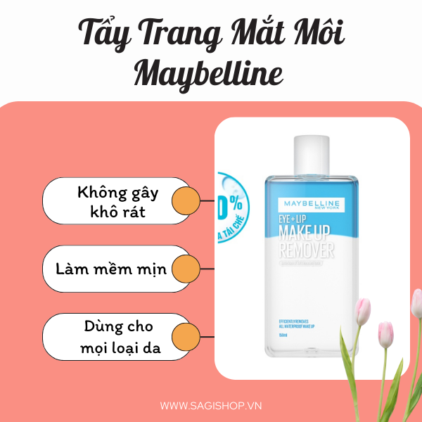 - Tẩy trang mắt môi Maybelline Makeup Remover Eye And Lip nhẹ nhàng làm sạch hết lớp make up trên da như son môi, mascara, kẻ mắt nước.. ngay cả các sản phẩm make up không thấm nước hay lâu trôi mà các loại nước tẩy trang khác khó lòng làm sạch hết.