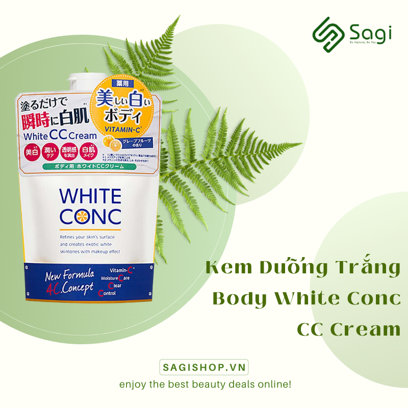 White Conc CC Cream là dòng sản phẩm kem dưỡng thể đến từ thương hiệu White Conc nổi tiếng của Nhật Bản, với thành phần chính là Vitamin C chiết xuất từ cam giúp dưỡng sáng da toàn thân, đồng thời kích thích tái tạo tế bào da, cải thiện các tổn thương từ sâu bên trong. Chất kem lỏng nhẹ cùng mùi hương tươi mát của cam chanh và vỏ bưởi, tạo cảm giác sảng khoái dễ chịu. Đặc biệt, kem còn có khả năng nâng tông và che phủ các khuyết điểm, cho làn da đều màu và sáng mịn.