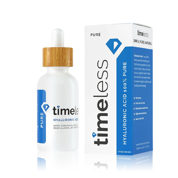 Timeless Hyaluronic Acid Pure là serum dưỡng ẩm của hãng mỹ phẩm Timeless của Mỹ. Sản phẩm chứa 100% Hyaluronic Acid nguyên chất giúp tối đa khả năng cấp nước, kích thích sản sinh Collagen cho da.