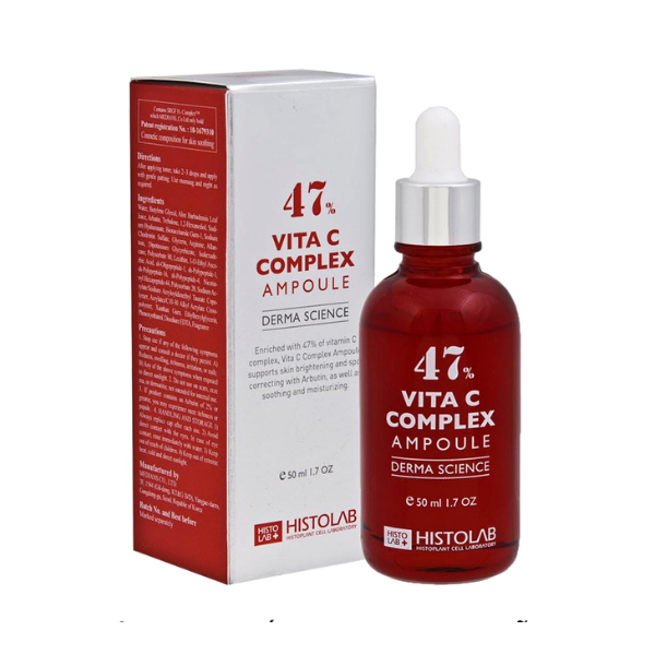 Histolab 47% Vita C Complex Ampoule Derma Science chứa 47% phức hợp Vitamin C cùng các hoạt chất: Arbutin, Hyaluronic,… giúp dưỡng trắng da, ngăn chặn sự hình thành melanin, làm mờ sạm nám và đốm nâu, cải thiện sắc tố, dưỡng đều màu da, thúc đẩy sản sinh collagen, tăng cường khả năng đàn hồi và săn chắc da, gia tăng tuần hoàn máu, lấy đi oxygen hoạt hóa, ngăn chặn lão hóa da, thu nhỏ lỗ chân lông, bổ sung các thành phần dưỡng chất thiết yếu từ thiên nhiên giúp dưỡng trắng sáng và trẻ trung hơn,..