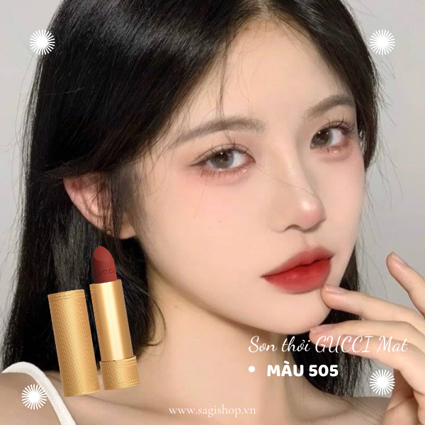 Tông màu 505 của GUCCI Mat là sự kết hợp tuyệt vời giữa sắc đỏ đất và chút nâu ấm áp. Màu sắc tinh tế này phản ánh sự thanh lịch và sang trọng của thương hiệu GUCCI, đồng thời cũng dễ dàng phù hợp với nhiều phong cách trang điểm và trang phục.