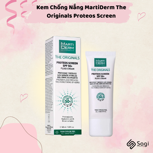 Kem Chống Nắng MartiDerm The Originals Proteos Screen SPF50+ Fluid Cream kem chống nắng dạng lỏng dễ hấp thụ với chỉ số SPF 50+ giúp ngăn ngừa và sửa chữa các dấu hiệu lão hoá da sớm. Sản phẩm cung cấp màng lọc chống nắng phổ rộng chống lại các tia UVA, UVB, IR (hồng ngoại), HEV (ánh sáng xanh). Sự kết hợp của Proteoglycans, phức hợp Spectrum Complex, phức hợp Hyaluronic Acid & Silicon Complex giúp giữ cho làn da trẻ trung, tươi tắn và đều màu. Kết cấu dạng cream-to-powder độc đáo mang lại cảm giác mượt mà, mỏng nhẹ tựa "vô hình" trên da, lý tưởng dành cho mọi loại da khi sử dụng hằng ngày .