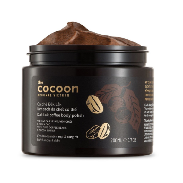Tẩy Da Chết Toàn Thân Cocoon Cà Phê Đắk Lắk là dòng tẩy tế bào chết toàn thân từ thương hiệu mỹ phẩm Cocoon của Việt Nam là một trong những sản phẩm với thành phần tự nhiên có nguồn gốc trong nước như hạt cà phê Đắk Lắk nguyên chất xay nhuyễn, hòa quyện cùng bơ cacao Tiền Giang giúp loại bỏ tế bào chết hiệu quả, làm đều màu da, mang lại năng lượng, giúp da trở nên mềm mại và rạng rỡ giúp mang đến cho bạn sản phẩm thuần chay tốt nhất với niềm tự hào từ nguyên liệu thuần Việt.