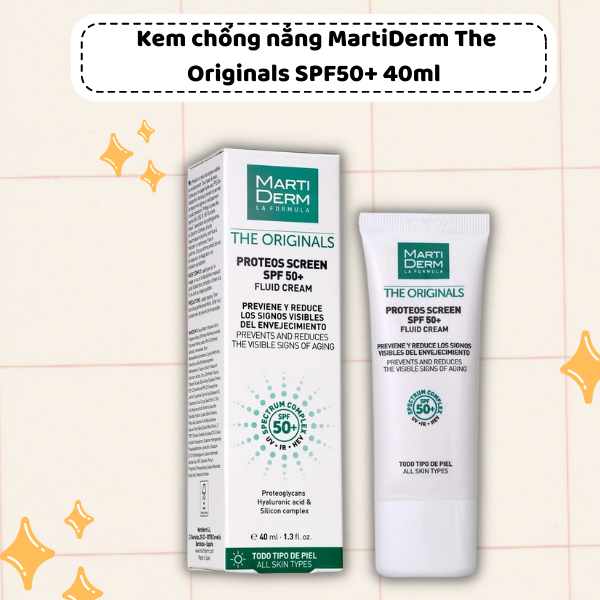Kem Chống Nắng MartiDerm The Originals Proteos Screen SPF50+ Fluid Cream kem chống nắng dạng lỏng dễ hấp thụ với chỉ số SPF 50+ giúp ngăn ngừa và sửa chữa các dấu hiệu lão hoá da sớm. Sản phẩm cung cấp màng lọc chống nắng phổ rộng chống lại các tia UVA, UVB, IR (hồng ngoại), HEV (ánh sáng xanh). Sự kết hợp của Proteoglycans, phức hợp Spectrum Complex, phức hợp Hyaluronic Acid & Silicon Complex giúp giữ cho làn da trẻ trung, tươi tắn và đều màu.