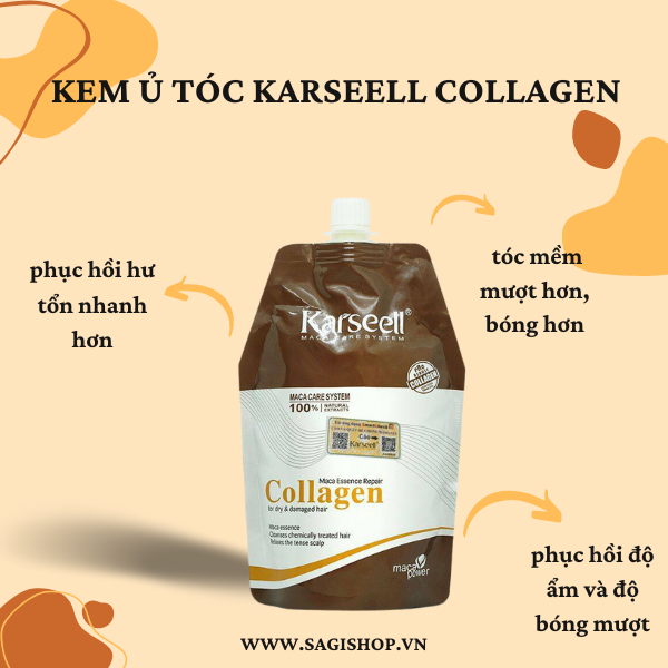 - Kem ủ phục hồi làm mềm tóc Karseell Collagen Maca Power 500ml giúp cho tóc mềm mượt hơn, bóng hơn và phục hồi hư tổn nhanh hơn.