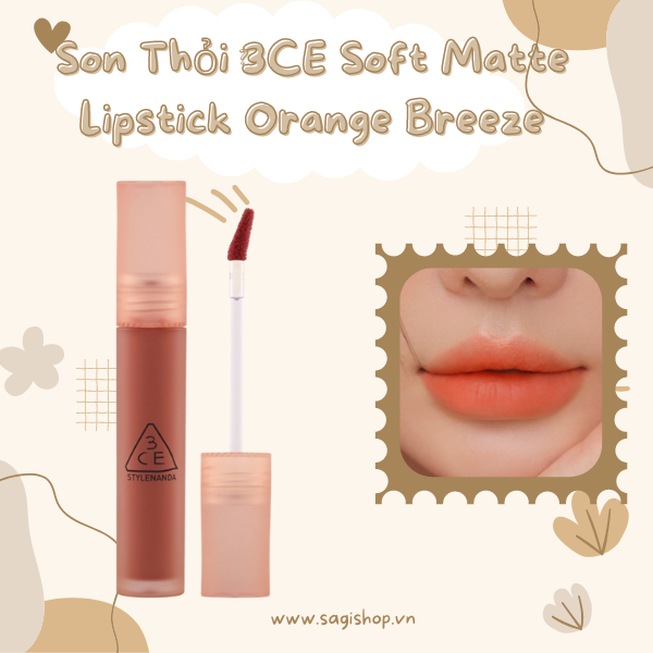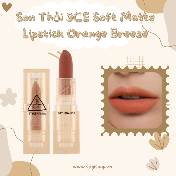 3CE Soft Matte Lipstick Orange Breeze là màu cam gạch pha đỏ sống động nhưng với sắc cam rõ rệt hơn. Cực kỳ phù hợp với những bạn sở hữu tông da warm-undertone.
