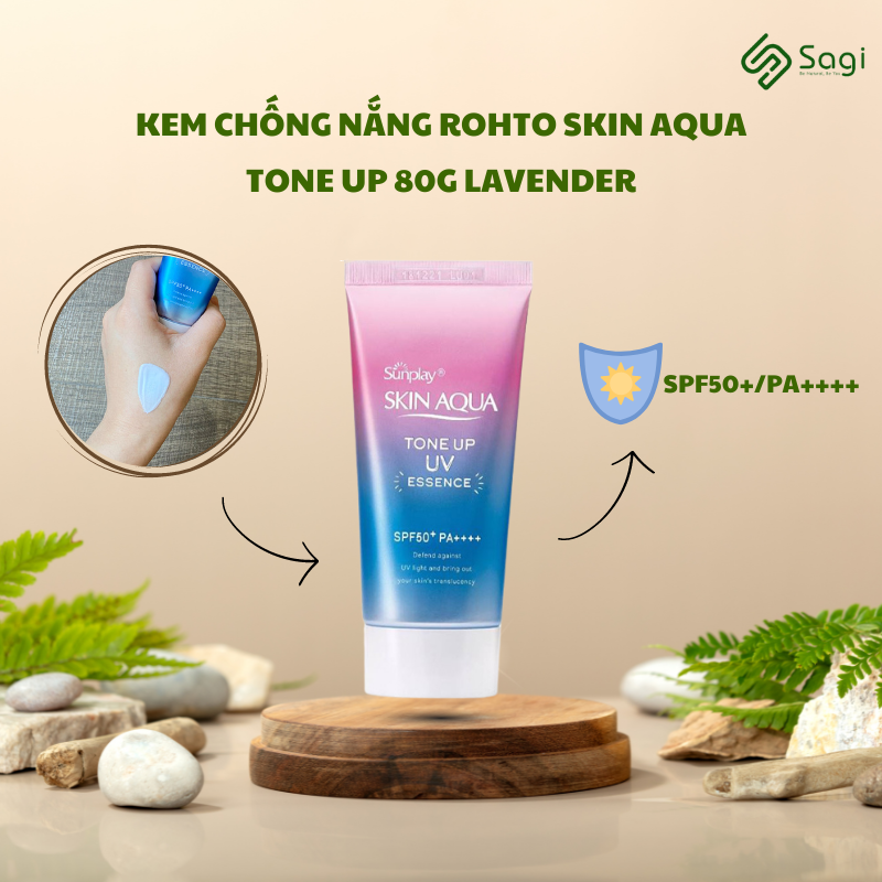 Kem chống nắng nâng tông Skin Aqua UV Essence - màu Lavender SFP50+/PA++++(80g) với công thức kiểm soát màu và ánh sáng đặc biệt hòa trộn nên chất kem màu tím Lavender giúp nâng tông làm trắng da tự nhiên của Rohto - Nhật Bản.