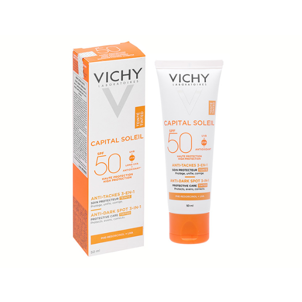 Kem chống nắng Vichy Capital Soleil Anti-Dark Spot 3-in-1 vạch cam (có màu) 50g Kem chống nắng SPF 50 PA++++ bảo vệ da trước tác hại của tia UVB (gây bỏng rát) và tia UVA (gây kích ứng, lão hóa sớm dẫn đến ung thư da). Đồng thời Kem chống nắng Capital Soleil Anti-Dark Spot giúp làm mờ các vết thâm nám trên da do tia UV gây ra, hỗ trợ làm đều màu da, dưỡng da sáng mịn.