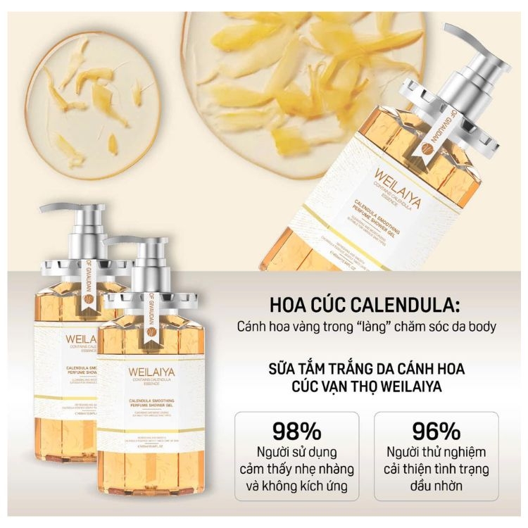 Sữa Tắm Trắng Da Weilaiya Calendula Hoa Cúc Vạn Thọ 450ml là dòng sữa tắm dưỡng trắng và làm dịu da nổi bật của Weilaiya. Với chiết xuất hoa cúc vạn thọ giàu hoạt chất chống oxy hóa, sản phẩm không chỉ giúp làm sạch nhẹ nhàng mà còn nuôi dưỡng, cải thiện sắc tố da, mang lại làn da sáng mịn, rạng rỡ.